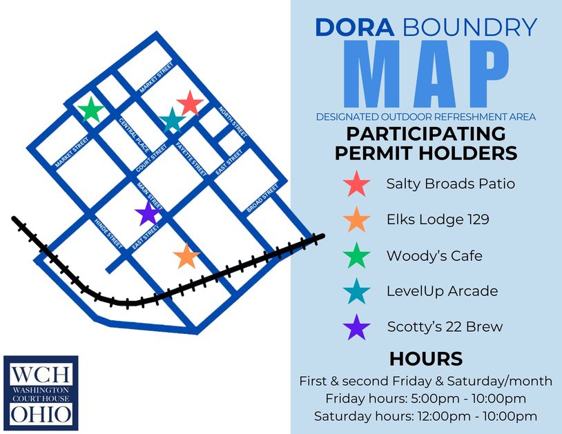The Designated Outdoor Refreshment Area (DORA) is a designated public area which allows alcoholic beverages to be purchased in a specifically designated cup from permitted establishments (vendors) and carried out of their establishments and into the district during specified days and times. Individuals of legal age will be allowed to walk within the boundaries of the district with an alcoholic beverage from participating vendors.